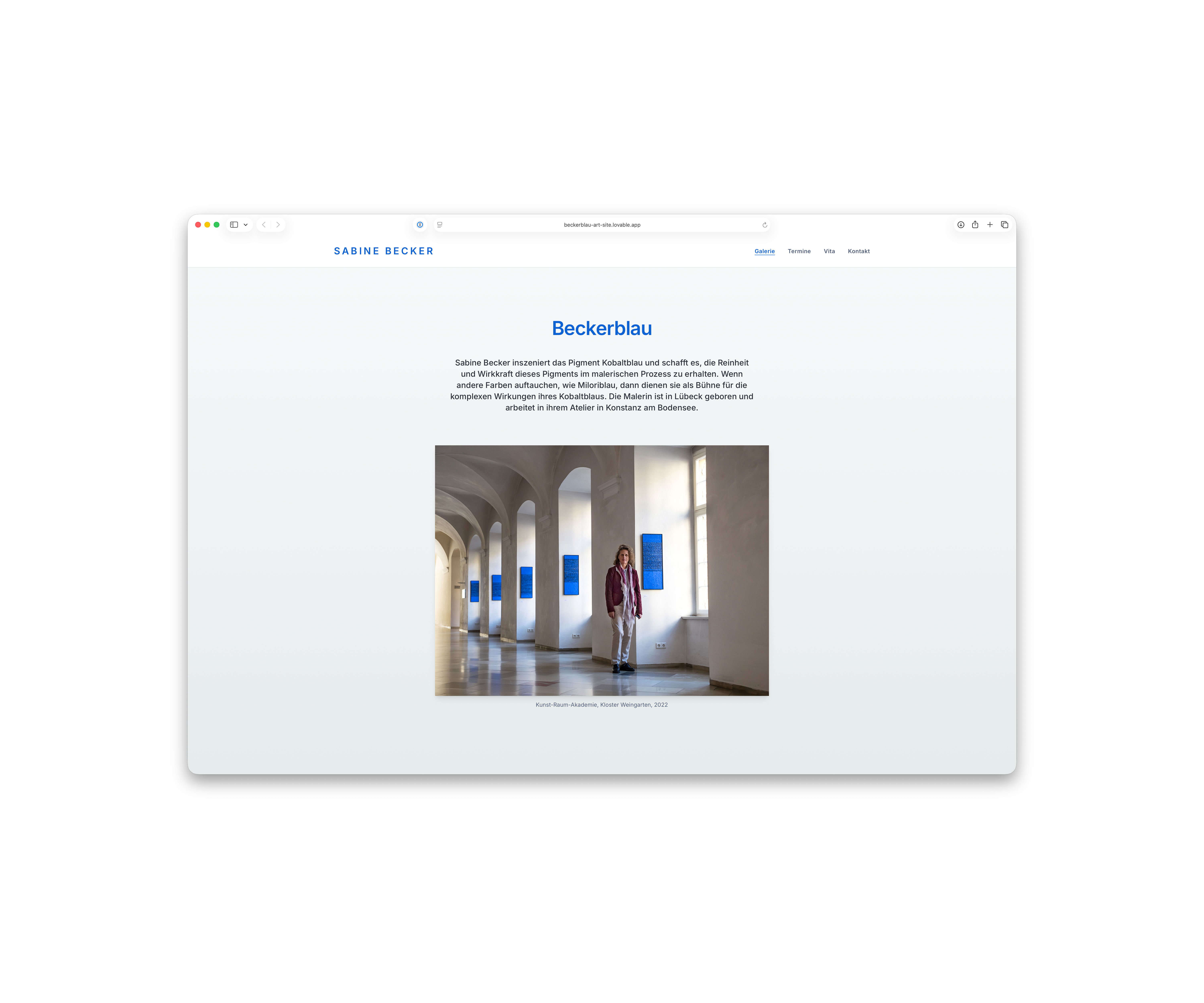 The painter Sabine Becker lives and works on Lake Constance. She consistently focuses on the color blue, or more precisely: cobalt blue. Color is her actual means of expression, and the reduction to the color blue is a central feature of the artist's work. Blue, the color of distance and unlimited dimensions, has the effect of a monochromatic explosion on the viewer. Sabine Becker's works show a structured surface that emphasizes the materiality of color and has a strong haptic character. Her works are represented in numerous public collections and have been shown at exhibitions from A for Appenzell to T for Tokyo.