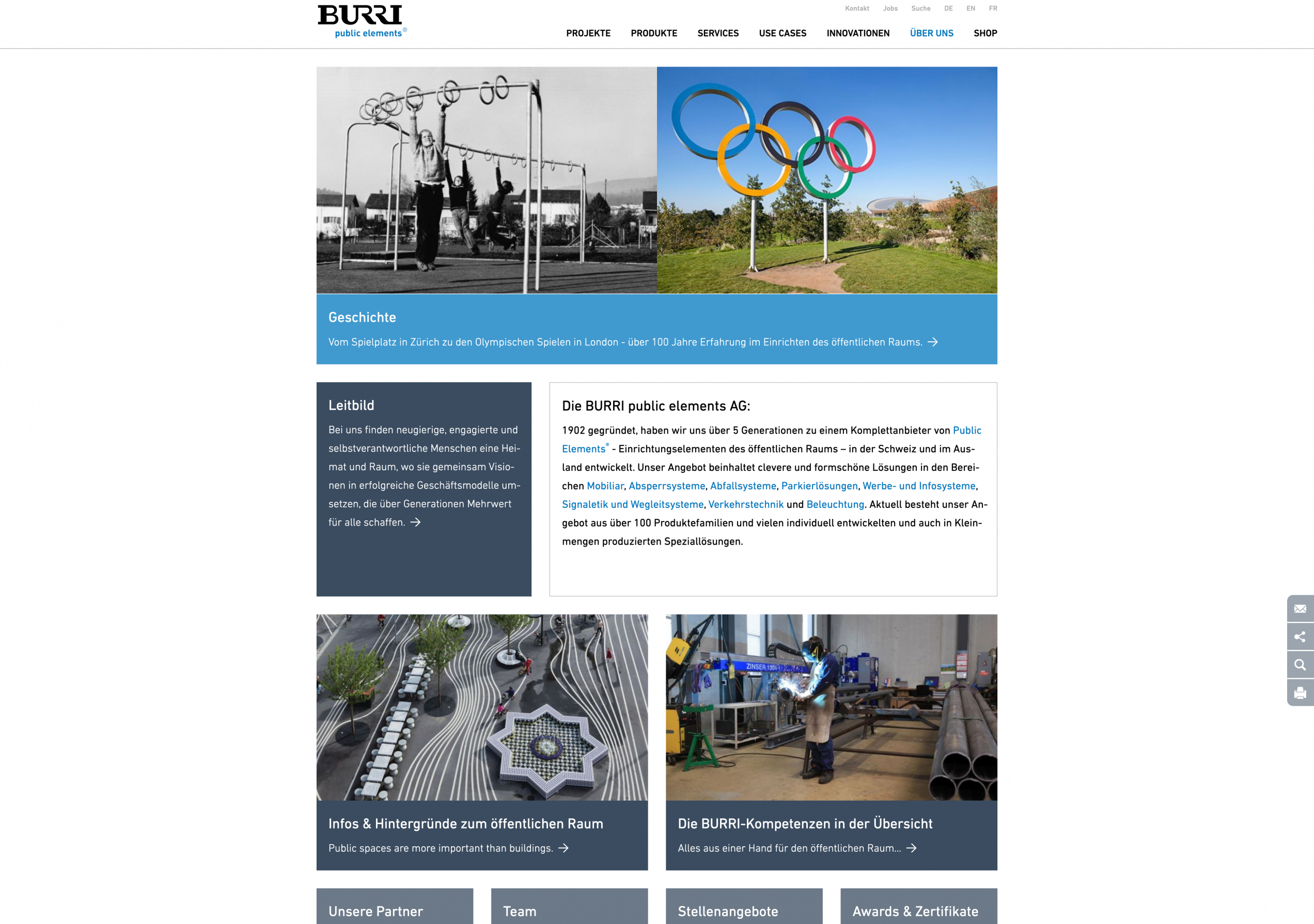 BURRI public elements AG was founded in 1907 and is now managed by the fourth generation. The Swiss company specializes in high-quality Public Elements® and also implements complex infrastructure projects. The products are the measure of all things and when it comes to flagship projects such as the Olympic Athletes Village in London, BURRI is the first choice.