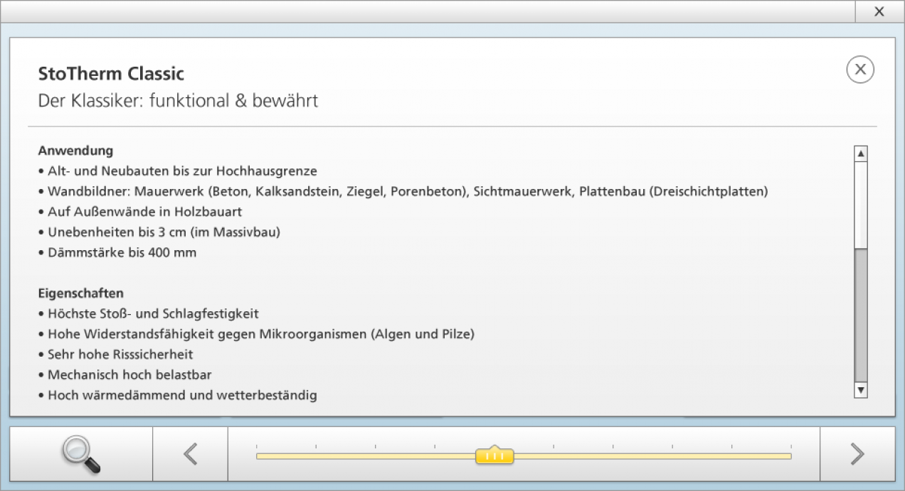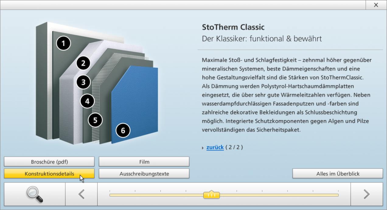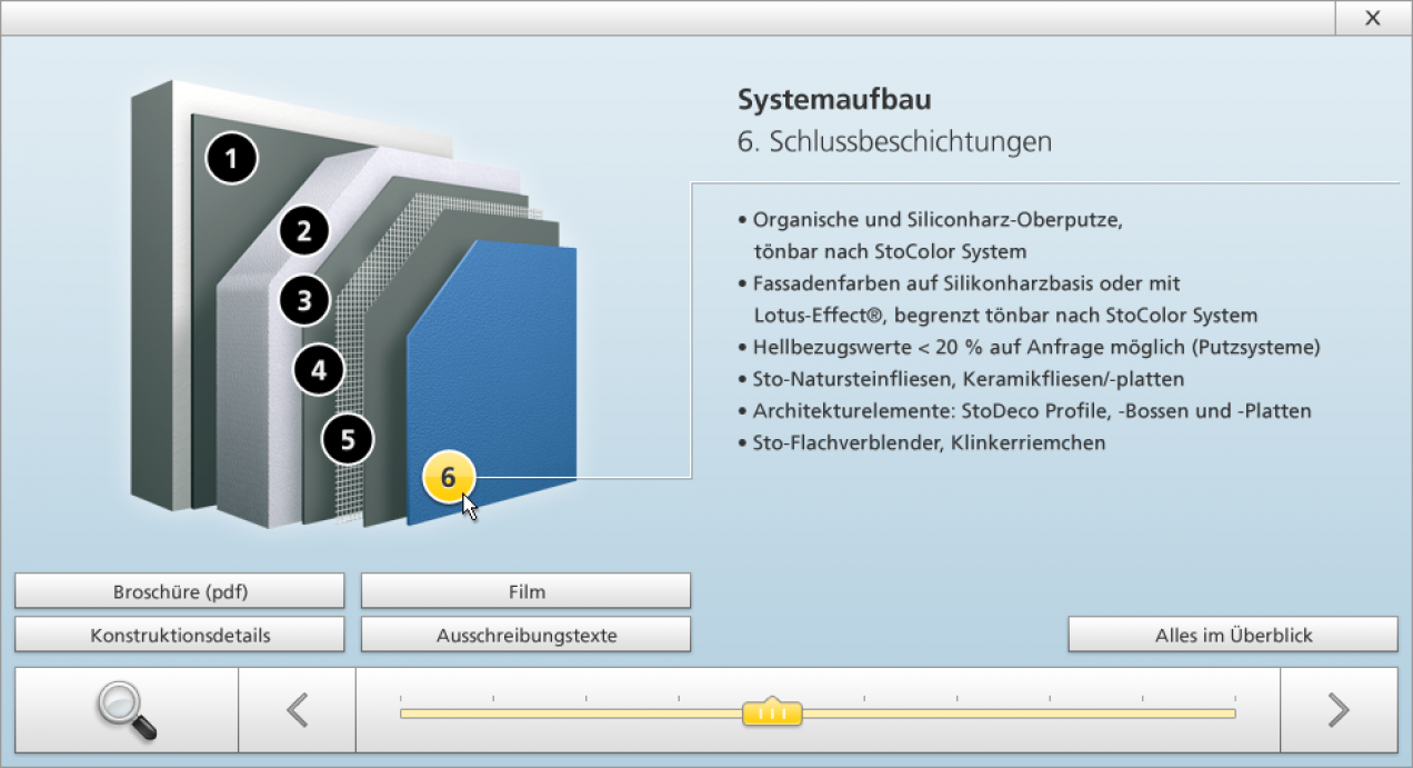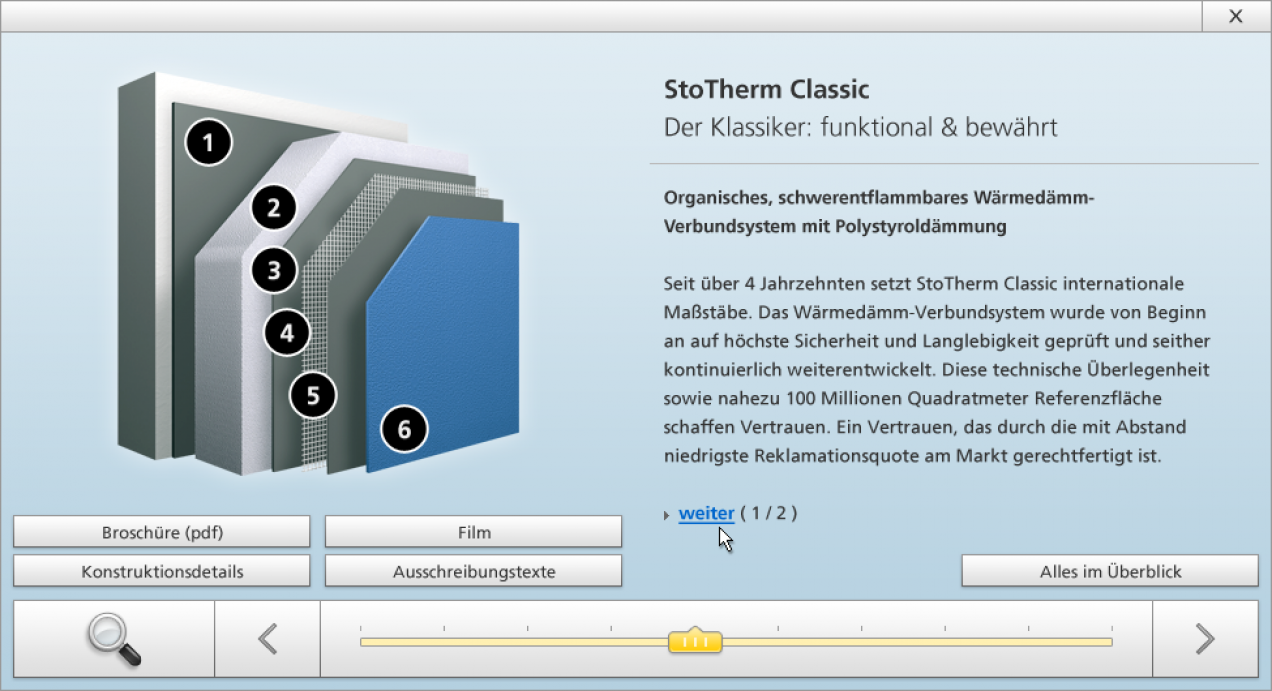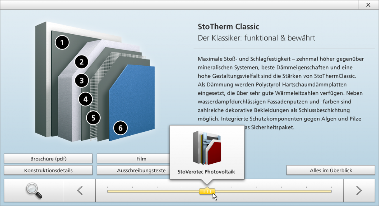 Facade insulation systems are currently in demand on the market - especially in countries where the use of these products is subsidized by the state and there is a high level of environmental awareness. Germany is in first place here, followed by France, Italy and Austria. The facade insulation systems form the core of the product portfolio of Sto AG). Their presentation is therefore of particular importance, especially as Sto facade insulation systems are complex products, which in turn are made up of various individual Sto products. We have developed the Sto Facade Insulation System Finder to present these adequately and make them comparable with each other: A web application based on Adobe Flash Web technology.
