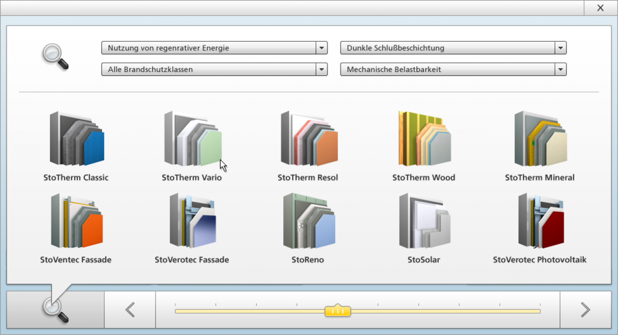 The web application is aimed at architects and craftsmen and enables both a quick, direct introduction to the topic (e.g. directly to StoTherm Classic) and a quick overview of the systems (on HTML level as a simple list and also within the web app as an overview including search or filter function). The user searches by narrowing down the overview of the systems by selecting certain criteria (such as "non-combustible").