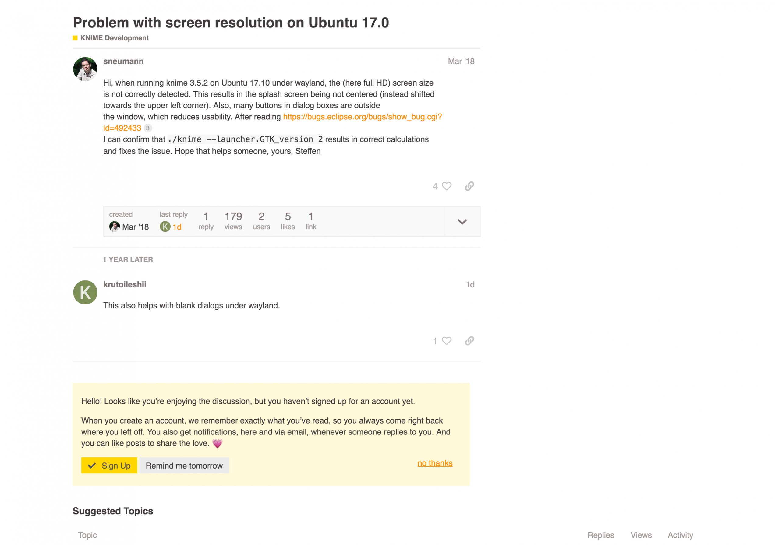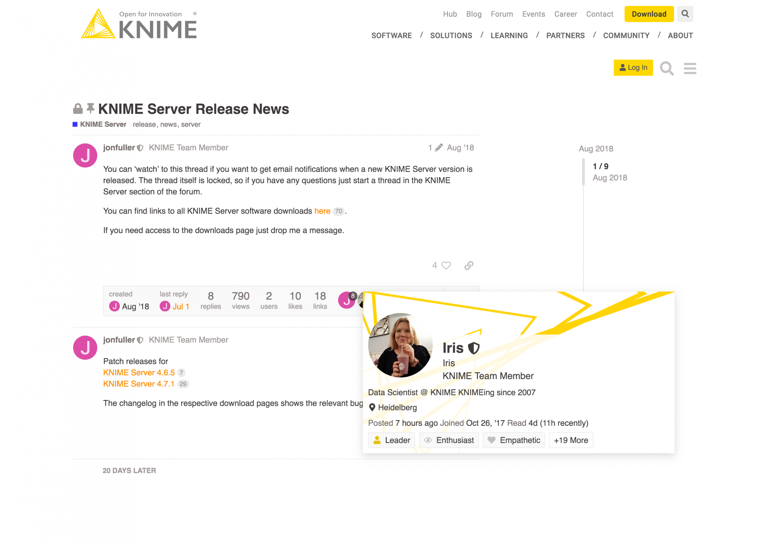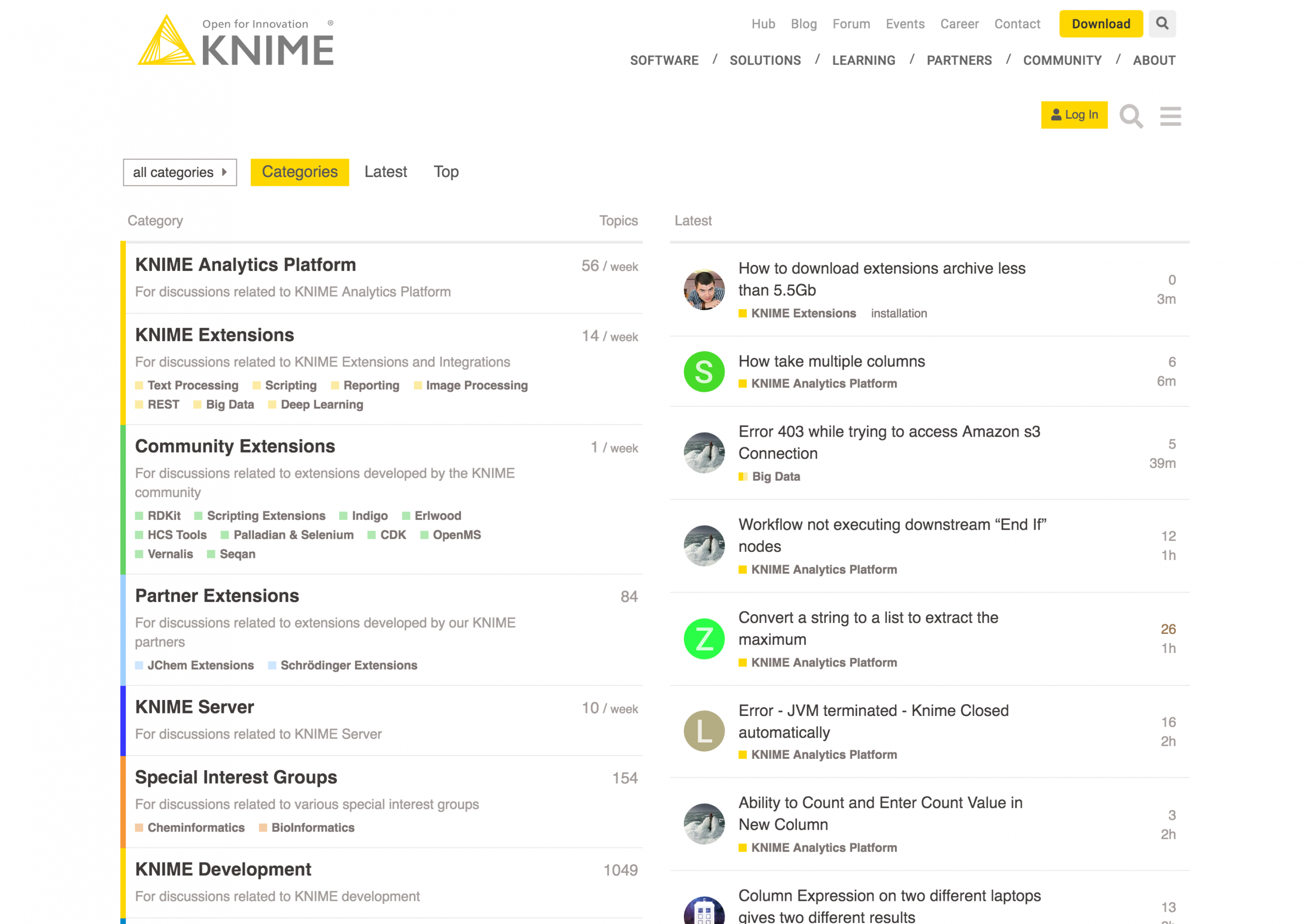 Wie für Software-Projekte im Open Source-Bereich üblich, gibt es ein Forum für Anwender und auch Entwickler, um sich dort zu Fragen rund um die KNIME Software (Anwendung, Erweiterungen, Entwicklung) auszutauschen. KNIME hat eine weltweite, sehr aktive Community mit über 25.000 Mitgliedern. Das Forum ist eine äußerst wichtige Anlaufstelle für Anwender – ursprünglich als Forum in Drupal 6 erstellt, war die Darstellung und User Experience des Forums jedoch längst nicht mehr auf dem aktuellen Stand, so dass eine Überarbeitung dringend geboten war.