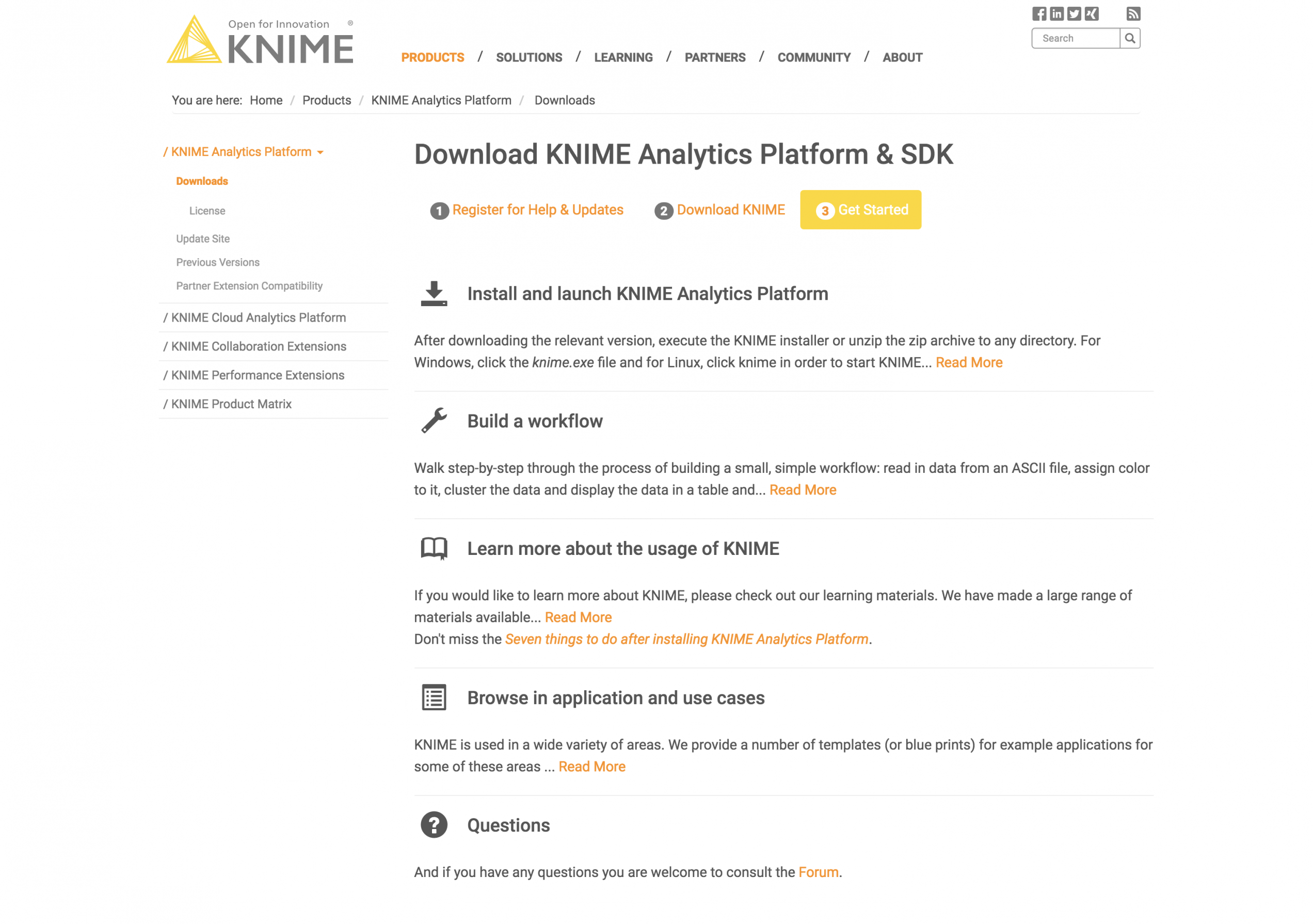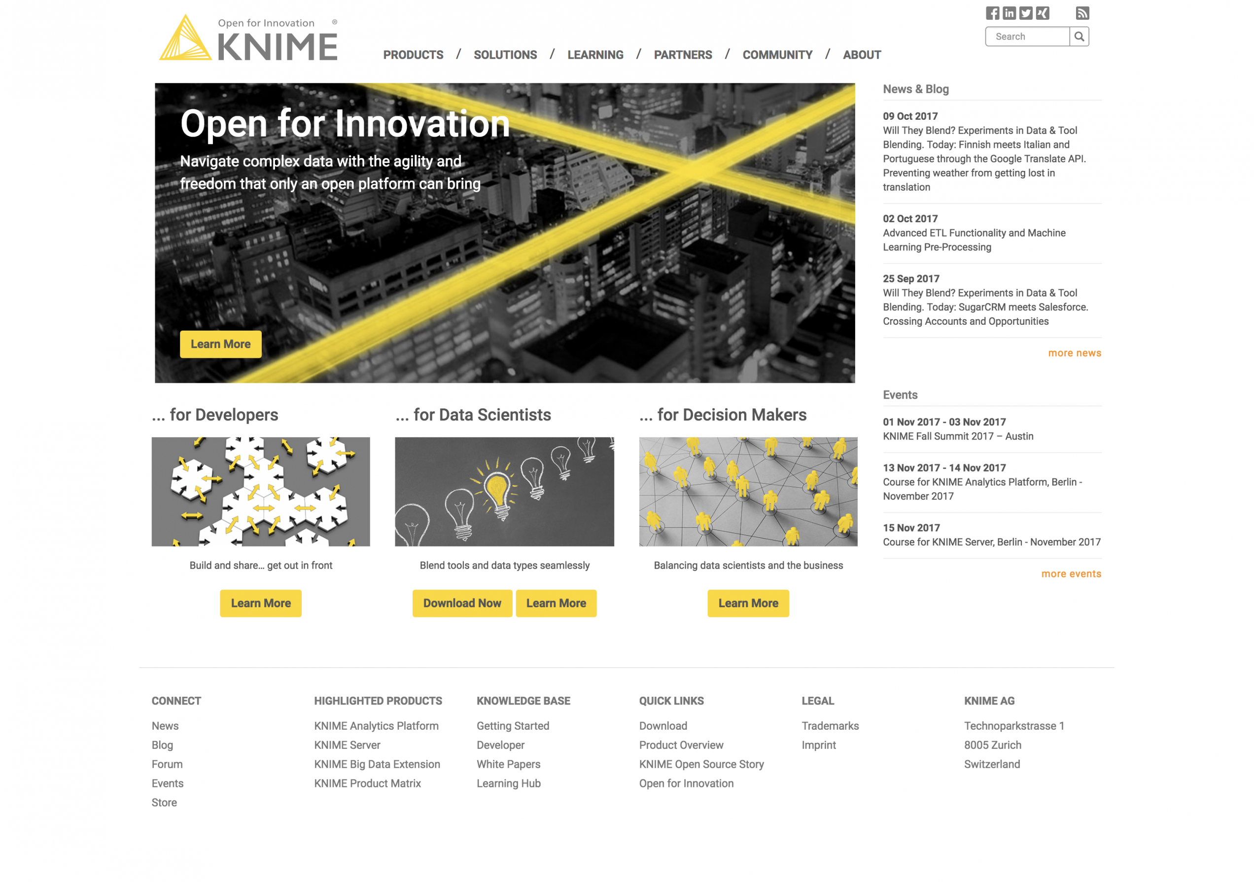 Die Website www.knime.com ist nicht nur Marketing Tool und Webshop (für Softwarelizenzen und eBooks), sondern vor allem auch die zentrale Anlaufstelle für die KNIME Community. Zudem werden über die Website die täglichen, weltweiten Downloads der freien KNIME Analytics Platform gesteuert.
